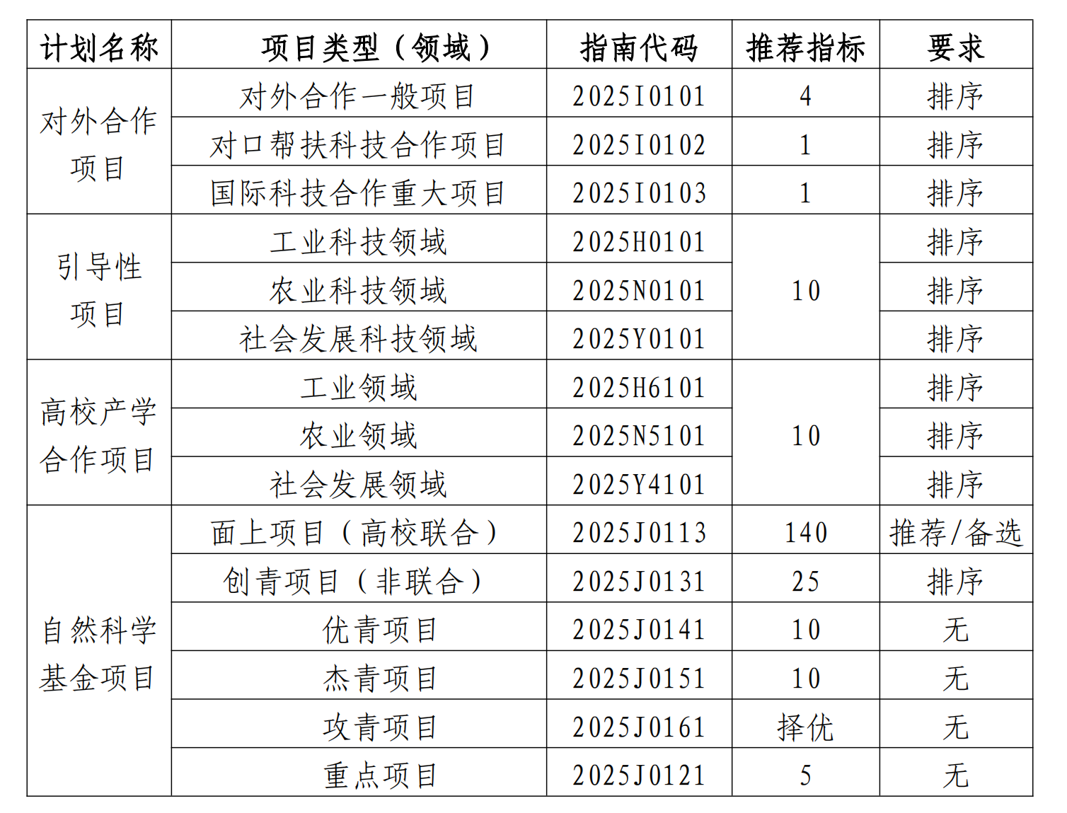 现转发《福建省科学技术厅关于组织申报2025年度省科技计划项目的通知》(闽科资〔2025〕1号),请按照通知要求,组织科研人员进行项目申报。各类项目申报指南详见福建省科学技术厅网站-通知公告(https://kjt.fujian.gov.cn/xxgk/tzgg/202501/t20250110_6698992.htm)。现将有关注意事项通知如下: