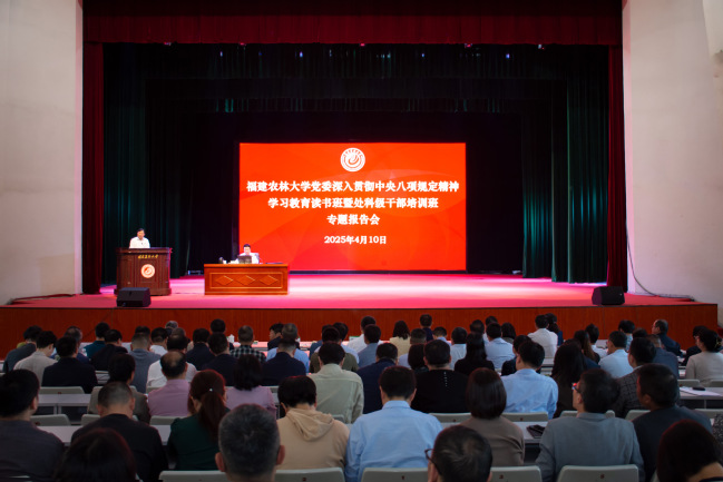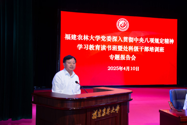 4月10日下午,学校举行深入贯彻中央八项规定精神学习教育读书班暨2025年全校处科级干部培训班专题报告会。省委党校党建教研部主任、省“百千万”人才专家刘明教授应邀作专题报告。报告会以线上线下相结合的方式,在金山校区大礼堂设主会场,旗山校区、安溪校区设分会场。校领导赖海榕、兰思仁、陈世奎、曾华平、郑宝东、唐振鹏、陈艳出席,全体处科级干部、师生党支部书记共约650人参加。报告会由校长兰思仁主持。