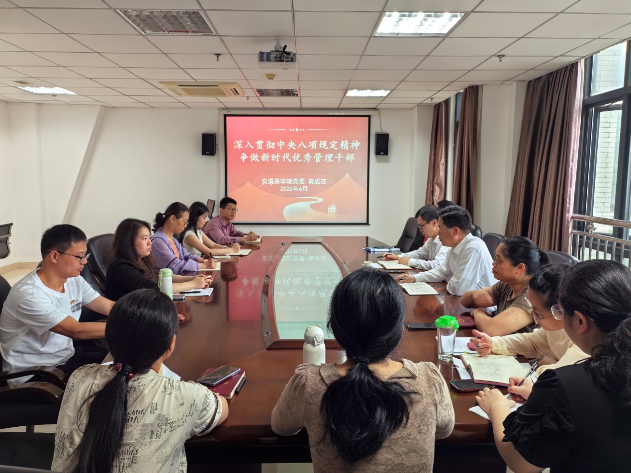 5月28日上午,安溪茶学院行政教工党支部开展深入贯彻中央八项规定精神学习教育专题党课,邀请学院党委书记黄成茂主讲,支部全体党员参加。
