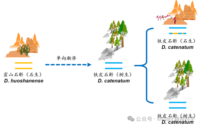 本研究通过对铁皮石斛(24个群体)与霍山石斛(3个群体)进行全基因组重测序及群体低覆盖度测序(共计216个个体),系统分析了两者的种群迁移历史、种间渐渗模式、渐渗基因鉴定及其在不同胁迫条件下的表达差异。结果表明,来自本地物种的低水平单向渐渗促进了入侵物种对极端岩石生境的占领,揭示了单向渐渗在草本植物响应极端环境中的分子机制,并为追溯物种进化过程中渐渗基因的功能“痕迹”提供了新方法。