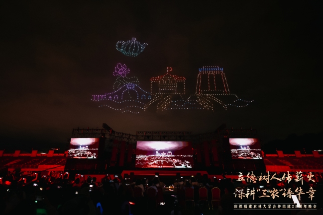 震撼的无人机表演引起现场观众的共鸣,1000架无人机以夜空为幕,依次绘就了学校1936年与1940年的办学起点、2000年合并组建的历史时刻、熠熠生辉的校徽与校训、立体的“25”周年标识、学习贯彻重要回信精神等12幅光影画卷,表达了学习贯彻习近平总书记重要回信精神的决心和对学校明天更美好的真挚祝福。