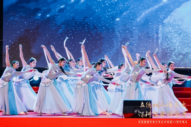 表演唱《种子》是袁隆平院士作词的歌曲,艺术化地呈现了二十五年前两校合并播下的希望“种子”,如今已根深叶茂、硕果累累。舞蹈《千揉百捻》则通过刚毅的肢体语言,展现了闽台共传的制茶工艺,体现了两岸同根同源的文化匠心与融合精神,更寓意着福农人在科研攻关、人才培养和服务两岸融合发展中,精益求精、百炼成钢的执着追求。
