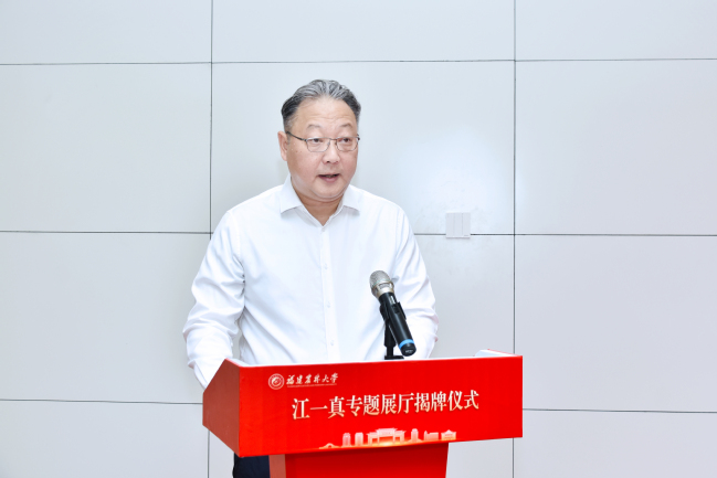 揭牌仪式上,赖海榕代表学校致辞,向莅临的领导嘉宾表示热烈欢迎,向远道而来的江一真老校长的亲属们致以崇高的敬意和诚挚感谢。他指出,江一真老校长是学校的奠基者和开拓者,为学校初创与发展倾注了心血,留下了弥足珍贵的办学思想和精神财富。今年是江一真老校长诞辰110周年,建设专题展厅既为寄托深切的缅怀与崇高的敬意,更要将江一真老校长坚定的信念、求真的勇气、为民的情怀与实干的作风,凝铸为薪火相传的精神火炬,成为照亮全校师生未来道路的灯火。他表示,学校将以此次揭牌为新的起点,用心守护好这片精神家园,持续完善展厅建设、丰富展陈叙事、提升观展体验,使之真正成为传承老校长精神、展现其不凡人生的温暖家园。将传承弘扬老校长的崇高风范,将其精神品格融入思政教育、师德师风和校园文化,引领师生见贤思齐、修身笃行、担当实干。将矢志践行老校长严谨求真的工作作风,锚定国家“双一流”目标,在学科建设上追求卓越,在人才培养上精益求精,在科研创新上勇攀高峰,在社会服务上担当作为,奋力谱写学校高质量发展的新篇章。