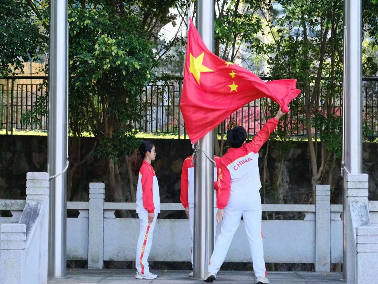 方阵入场后,升旗仪式正式开始。国歌奏响,旗手振臂扬旗,全体师生及领导面向国旗庄严肃立,行注目礼,共唱国歌。