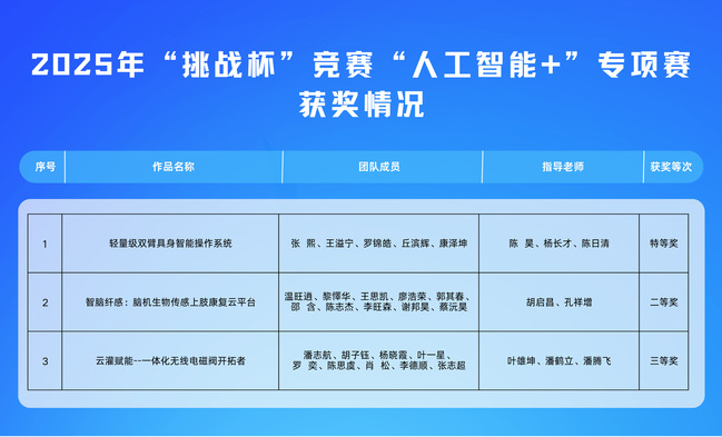 在“揭榜挂帅”擂台赛中,学校共16项作品获奖,夺得擂主(全国第1名)1项、特等奖1项、一等奖5项、二等奖3项、三等奖4项、优胜奖2项,总获奖数并列全国高校第32位。