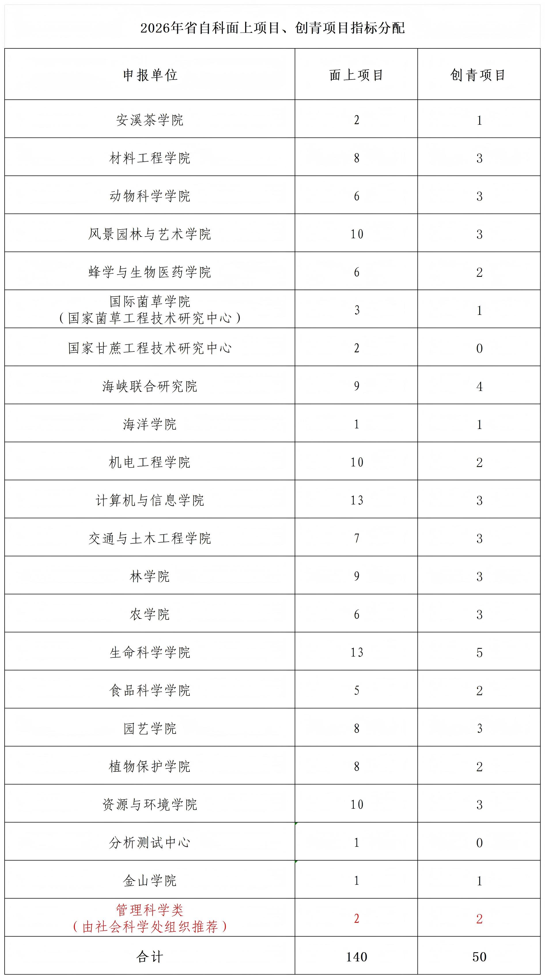五、省自然科学基金面上项目(高校联合)、创青项目推荐指标分配至各二级单位。指标分配情况如下表,各二级单位可酌情备选1项。