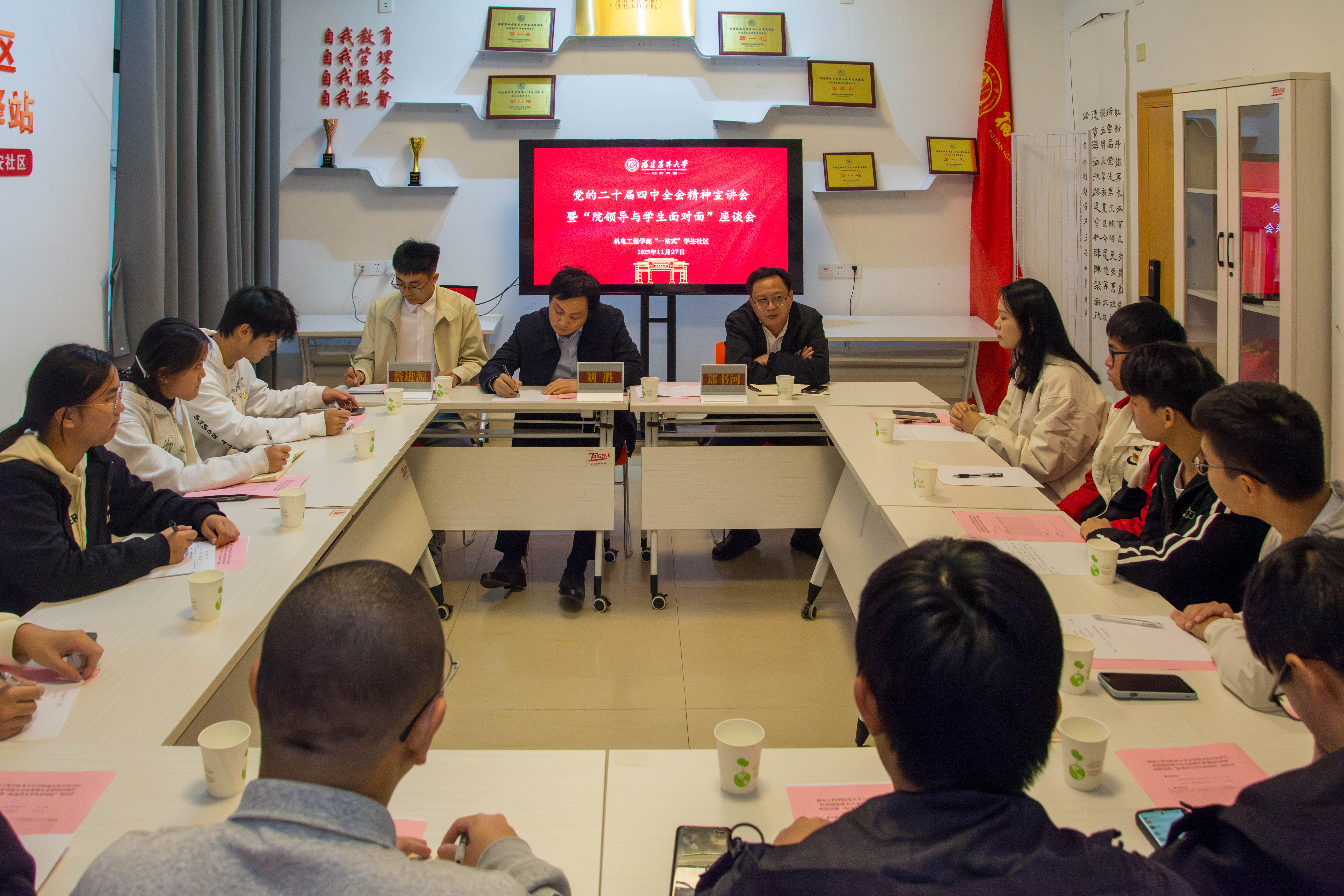 11月27日下午,机电工程学院在“一站式”学生顽强社区鹿鸣苑3号楼党团活动室举办深入学习贯彻习近平总书记给williamhill英国官网全体师生重要回信精神暨“院领导与学生面对面”座谈会。机电工程学院党委书记刘胜、副院长郑书河、学院研究生和本科生各年级专业学生代表、辅导员代表等,共同参加了座谈会。