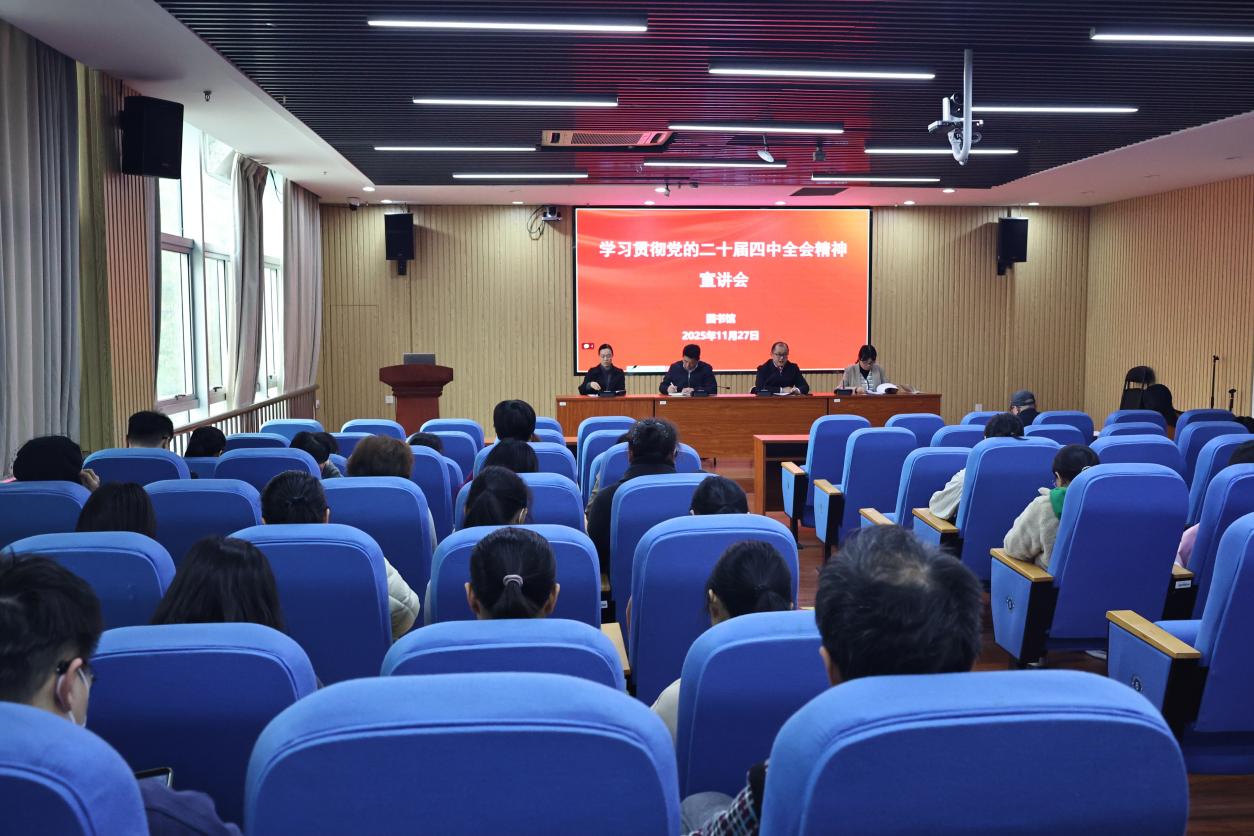 11月27日下午,图书馆在逸夫馆二楼视听阅览室召开学习贯彻党的二十届四中全会精神宣讲会,图书馆党委副书记(主持工作)叶扬捷主讲,全体教职工参会。会议由图书馆馆长苏时鹏主持。