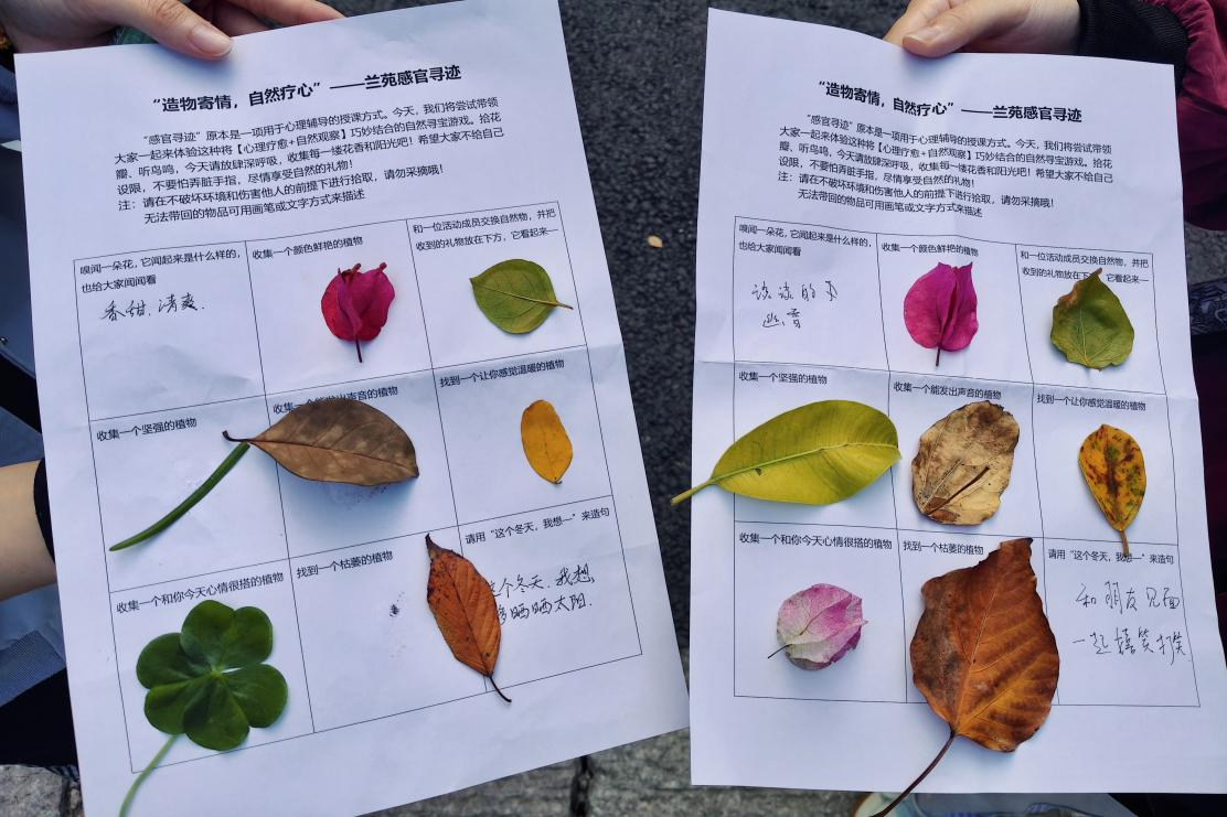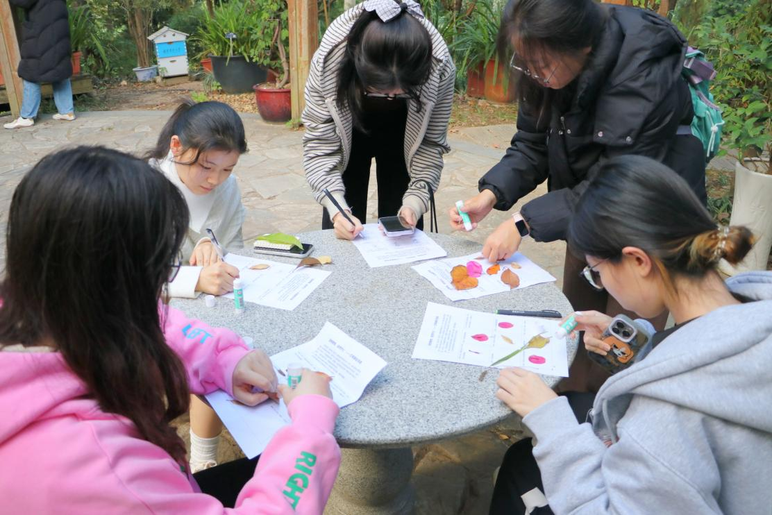 从“听”兰语中捕捉自然的韵律,到“观”寻色里解码生态的色谱,再到“嗅”兰香时唤醒记忆的共鸣,直至“触”拾趣间感知生命的质地——同学们在五感交织的沉浸场域中,完成了对生态的立体认知。活动现场,或驻足静听兰苑的鸟鸣与讲解,或结伴比对色卡与自然的色彩,或俯身拼贴叶脉与花瓣的纹理,各个环节自然串联,构成一个完整的多感官体验闭环。这种轻松而深入的任务式探索,让生态教育超越说教,在互动与创造中内化为对自然的深层感知与自发尊重。