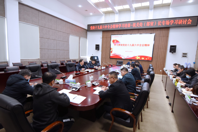 1月5日下午,受校党委书记王建南委托,校党委副书记曾华平主持召开机关部处长学习党的十九届六中全会精神专题研讨会,副校长唐振鹏、校党政办、纪委(监察专员办公室)、组织部等近30位机关部处负责人参加。