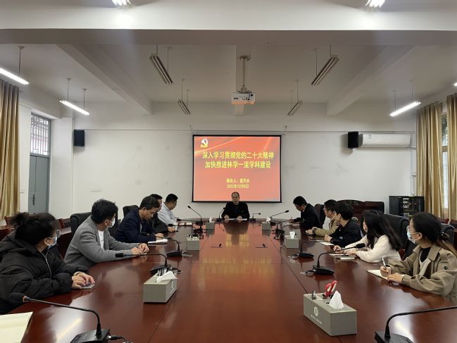 蓝天水强调,要把学习宣传贯彻党的二十大精神作为当前和今后一个时期的首要政治任务,切实把思想和行动统一到党中央决策部署上来,坚持党对教育工作全面领导,落实立德树人根本任务,扎实做好意识形态工作,把党的二十大精神贯彻落实到办学治院各个方面,为建设特色鲜明一流农林大学贡献智慧和力量。